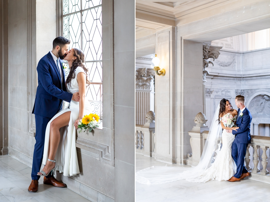 San Francisco City Hall offers several popular and beautiful spots for wedding photography. Some of the best include the Grand Staircase, the Mayor’s Balcony, the 4th floor gallery, and the 3rd floor windows and hallways, known for their natural light. Additionally, the building’s grand architecture provides numerous opportunities for stunning photos.
